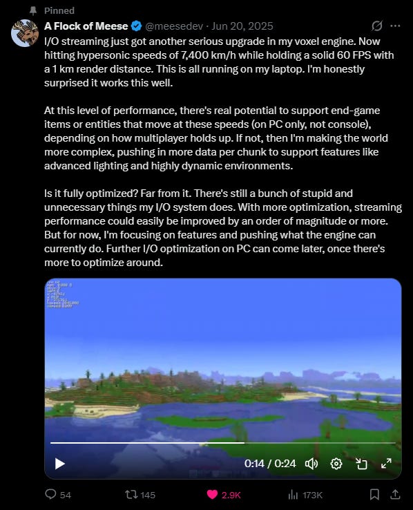 Contrast this with the industry standard high-performance game engine: Unreal Engine 5. With typical cell sizes of 256m^3, and loading ranges around 768m radius, you can’t sustain that speed without FPS drops (called “hitches” in their documentation).