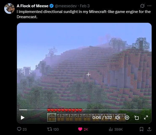 A Flock of Meese has been sharing his Minecraft-like game engine for the Gamecube and Dreamcast: