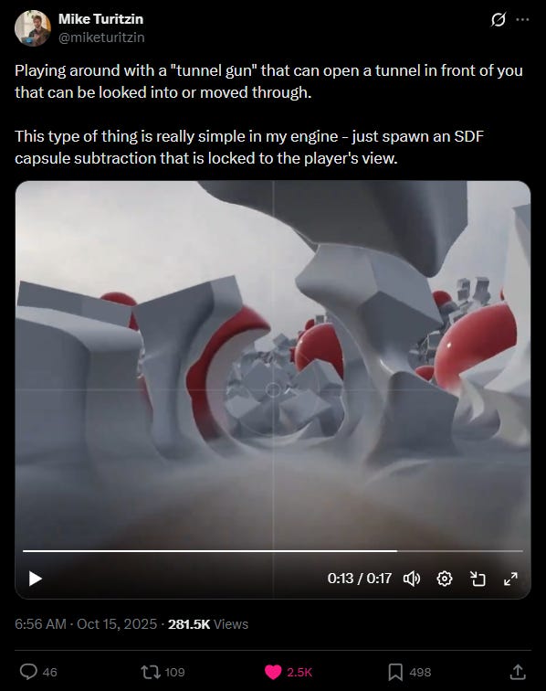 Mike Turitzin has been sharing his SDF-based game engine, and the results are something else: